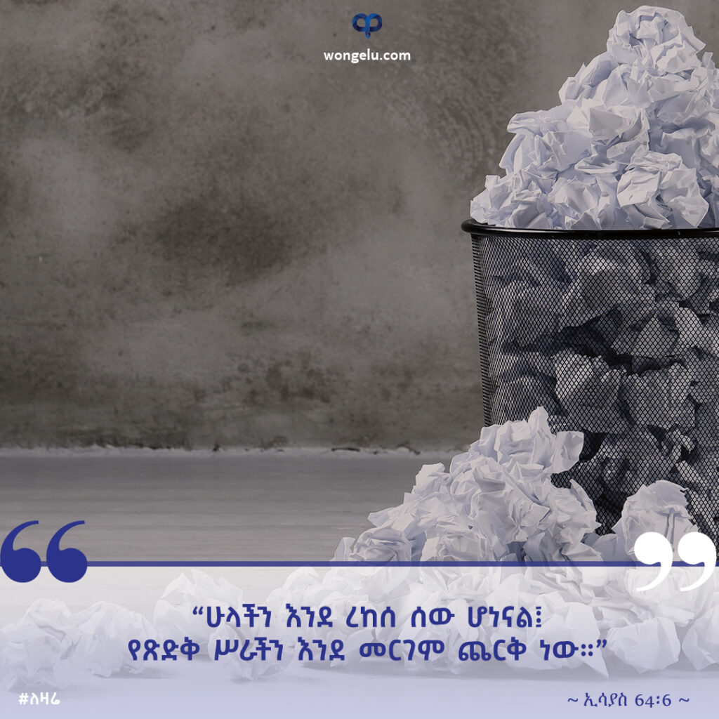 “ሁላችን እንደ ረከሰ ሰው ሆነናል፤ የጽድቅ ሥራችን እንደ መርገም ጨርቅ ነው።” (ኢሳይያስ 64:6)