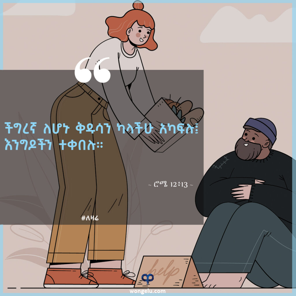 ችግረኛ ለሆኑ ቅዱሳን ካላችሁ አካፍሉ፤ እንግዶችን ተቀበሉ። (ሮሜ 12፥13)