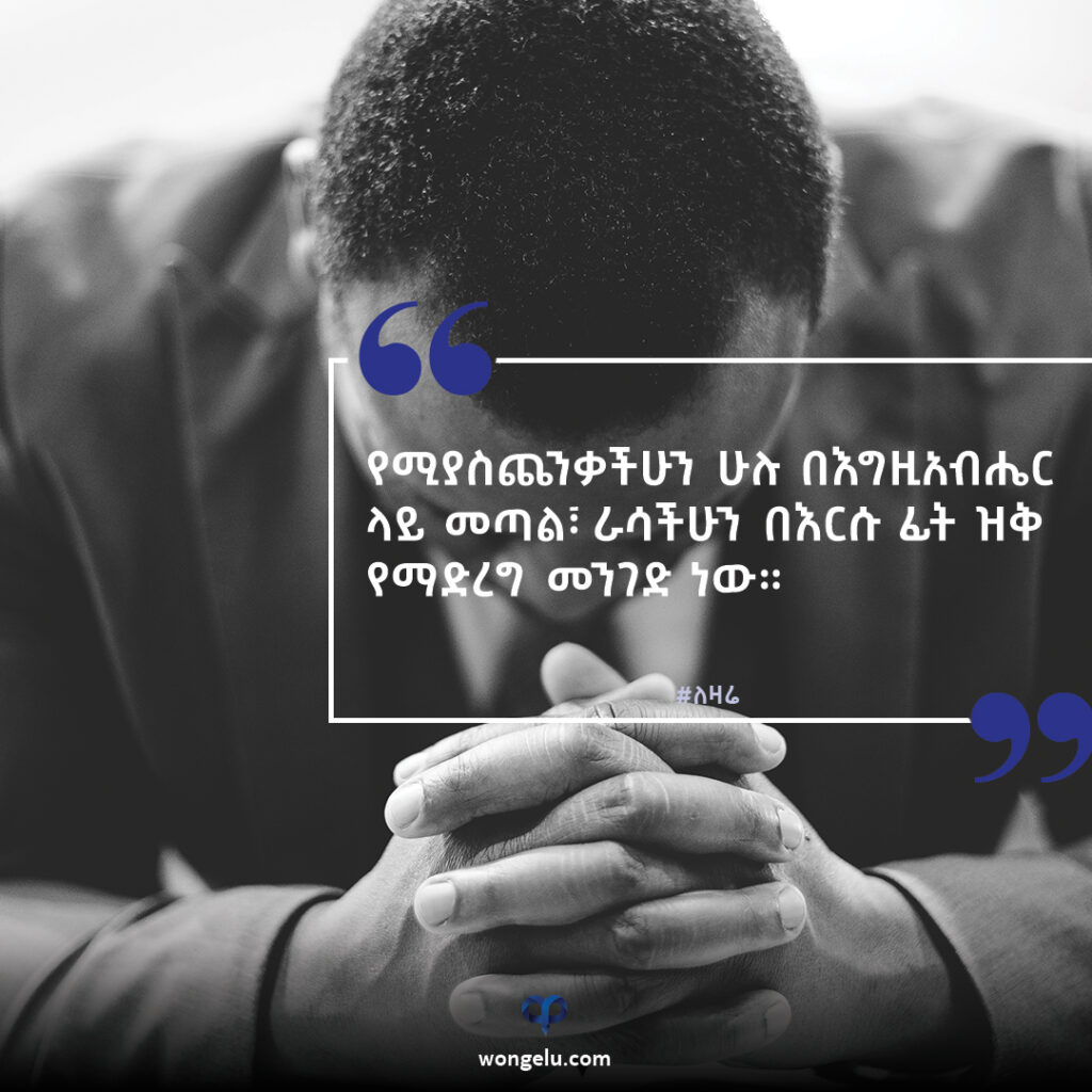 ስለዚህ እርሱ በወሰነው ጊዜ ከፍ እንዲያደርጋችሁ ከእግዚአብሔር ብርቱ እጅ በታች ራሳችሁን ዝቅ አድርጉ፤ እርሱ ስለ እናንተ ስለሚያስብ የሚያስጨንቃችሁን ሁሉ በእርሱ ላይ ጣሉት። (1ኛ ጴጥሮስ 5፥6-7)