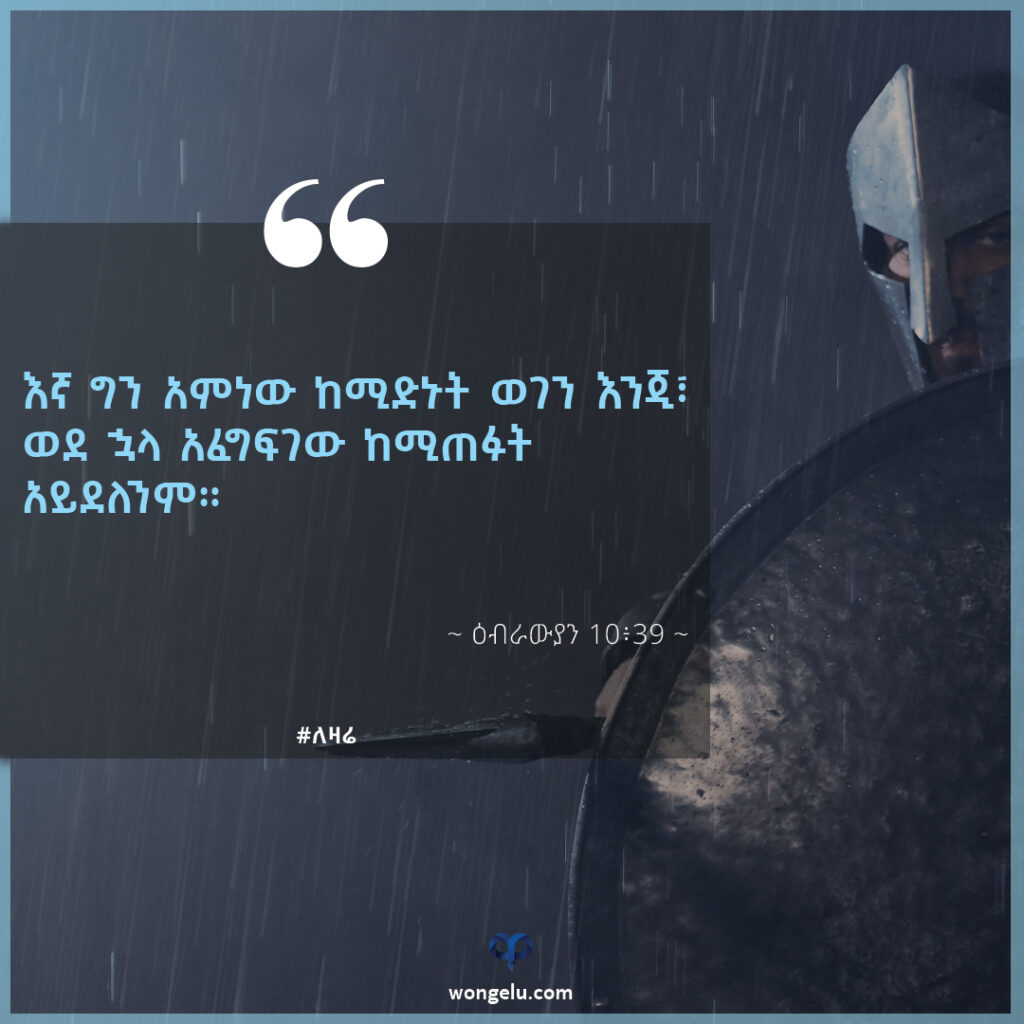 እኛ ግን አምነው ከሚድኑት ወገን እንጂ፣ ወደ ኋላ አፈግፍገው ከሚጠፉት አይደለንም። (ዕብራውያን 10፥39)