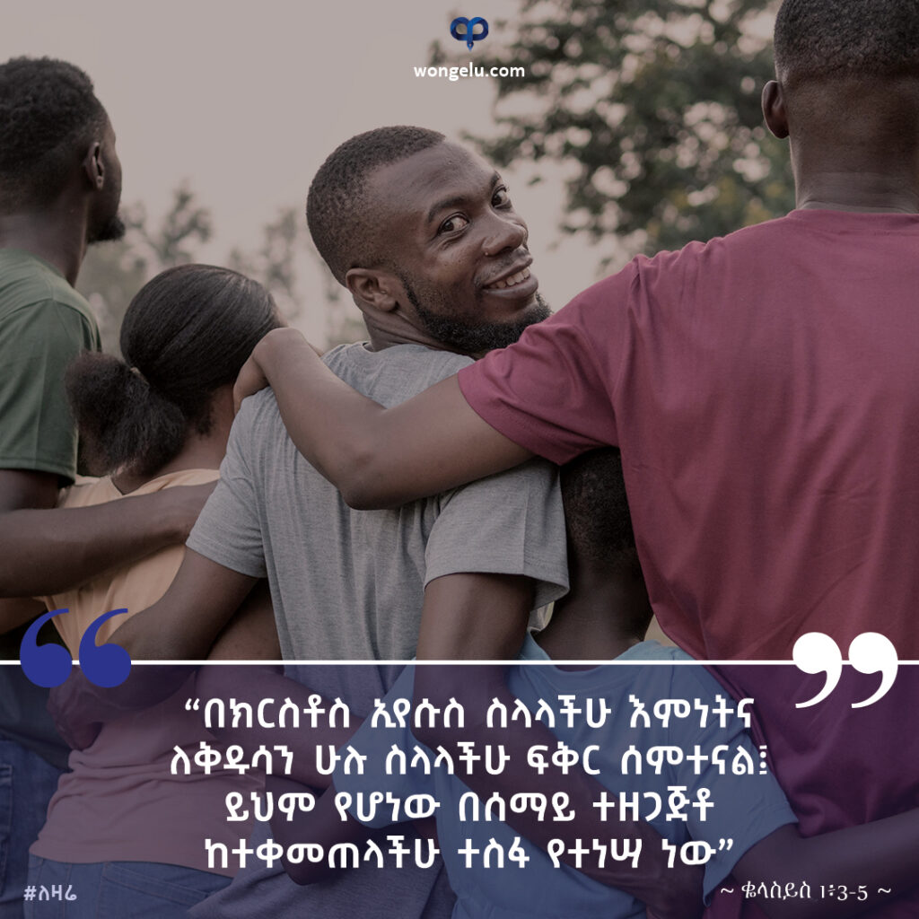 ስለ እናንተ በምንጸልይበት ጊዜ የጌታችንን የኢየሱስ ክርስቶስን አባት እግዚአብሔርን ሁልጊዜ እናመሰግናለን፤ ምክንያቱም በክርስቶስ ኢየሱስ ስላላችሁ እምነትና ለቅዱሳን ሁሉ ስላላችሁ ፍቅር ሰምተናል፤ ይህም የሆነው በሰማይ ተዘጋጅቶ ከተቀመጠላችሁ ተስፋ የተነሣ ነው።  (ቈላስይስ 1፥3-5)