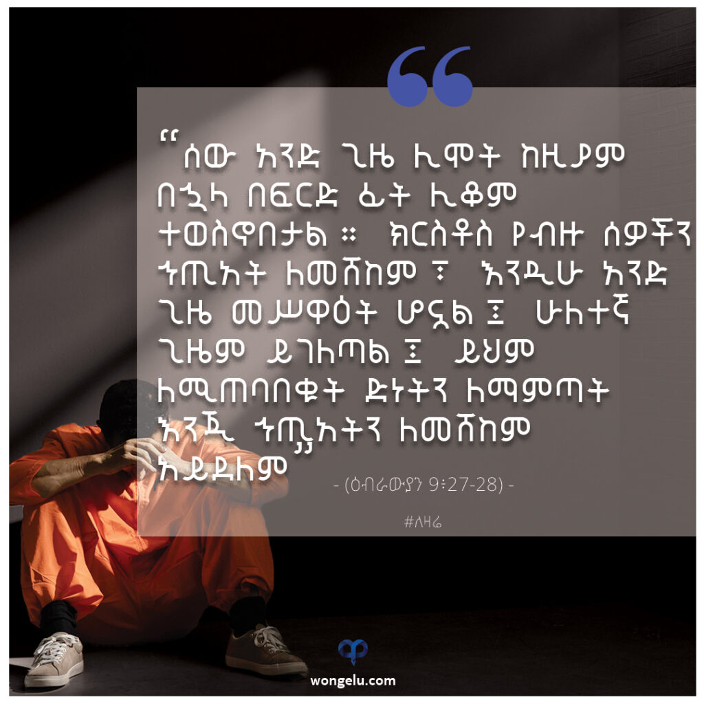 ሰው አንድ ጊዜ ሊሞት ከዚያም በኋላ በፍርድ ፊት ሊቆም ተወስኖበታል። ክርስቶስ የብዙ ሰዎችን ኀጢአት ለመሸከም፣ እንዲሁ አንድ ጊዜ መሥዋዕት ሆኖአል፤ ሁለተኛ ጊዜም ይገለጣል፤ ይህም ለሚጠባበቁት ድነትን ለማምጣት እንጂ ኀጢአትን ለመሸከም አይደለም። (ዕብራውያን 9፡27-28)